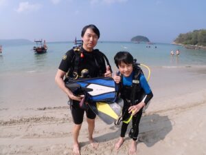 カラカラな暑期に入って暑さMAX、風も弱くて海遊びには最高の日々が続いています。今回はプーケット在住の皆様が親子で体験ダイビングにきてくれました。お母さん方はダイビング経験者ですが、11歳と10歳のボーイズは初めて!ドキドキワクワクです。